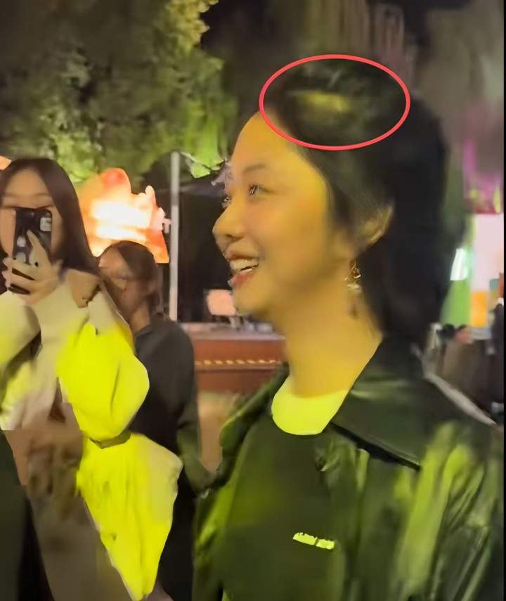 不过她是个发量王者,想来头发披散下来两块头皮就不显眼了。