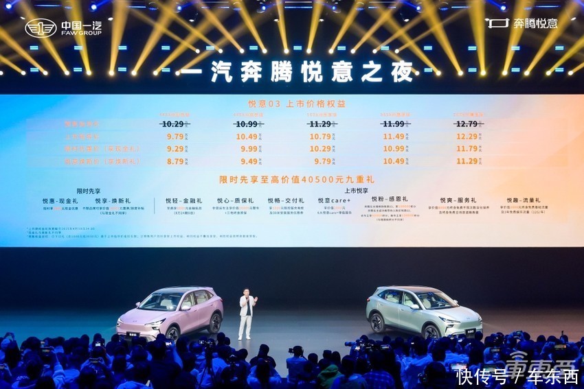 二、取消低配版 悦意03正式上市在发布会上,纯电SUV一汽奔腾悦意03也正式上市。一汽奔腾悦意03有445km、565km两种续航共5款车型,在预售价基础上直降5000元,上市指导价9.79万元-12.29万元,叠加限时现金红包后,价格为9.29万元-11.79万元,还可同时享受国家或地方政府的焕新补贴。